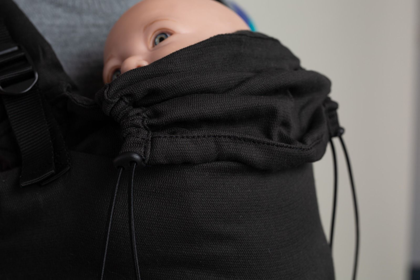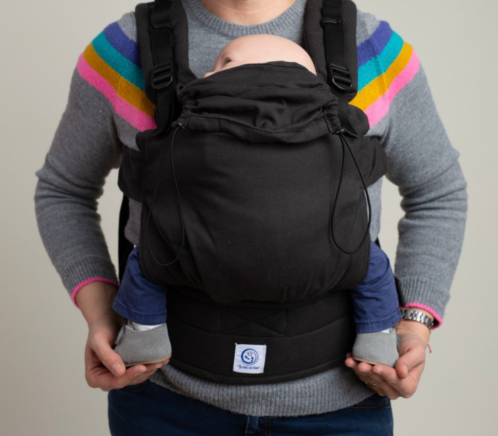 Sistemul este prevăzut cu glugă detașabilă, prinsă în capse, utilă pentru somn, sprijinul capului sau protecție împotriva vântului. Bebelușul poate fi purtat în față încă de la început, iar după 4–6 luni poate fi purtat și în spate sau pe șold, în funcție de preferințele purtătorului.