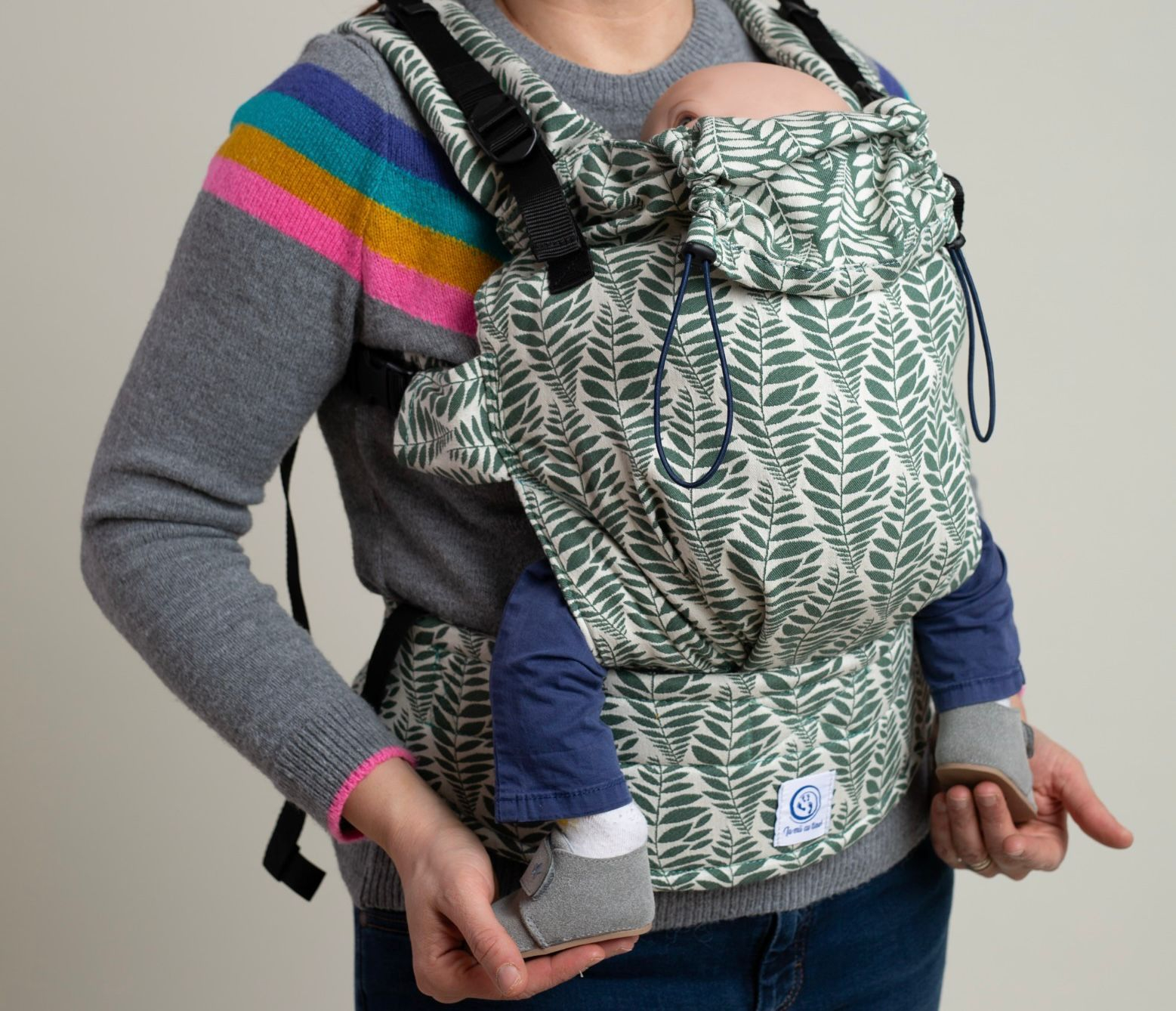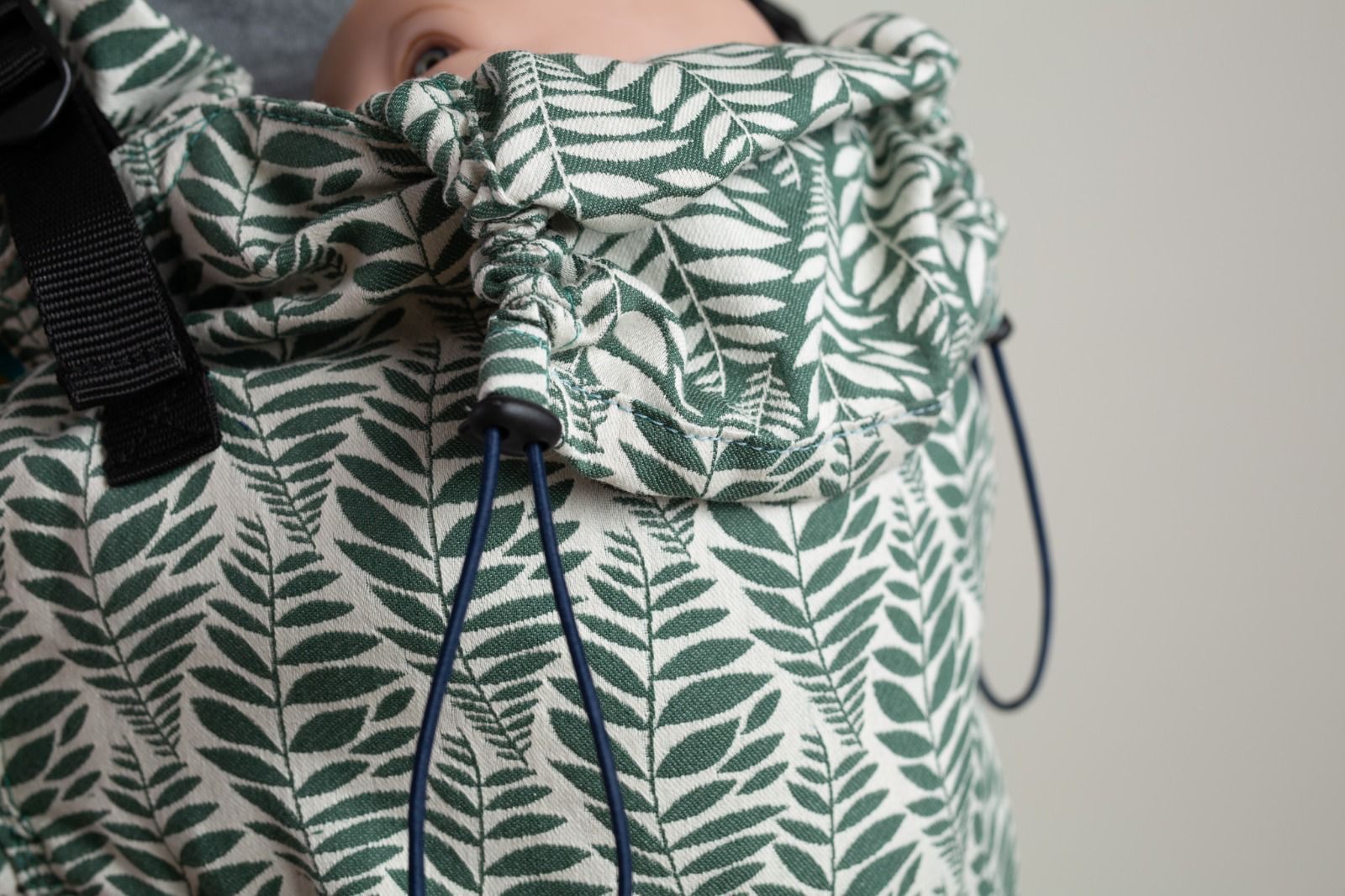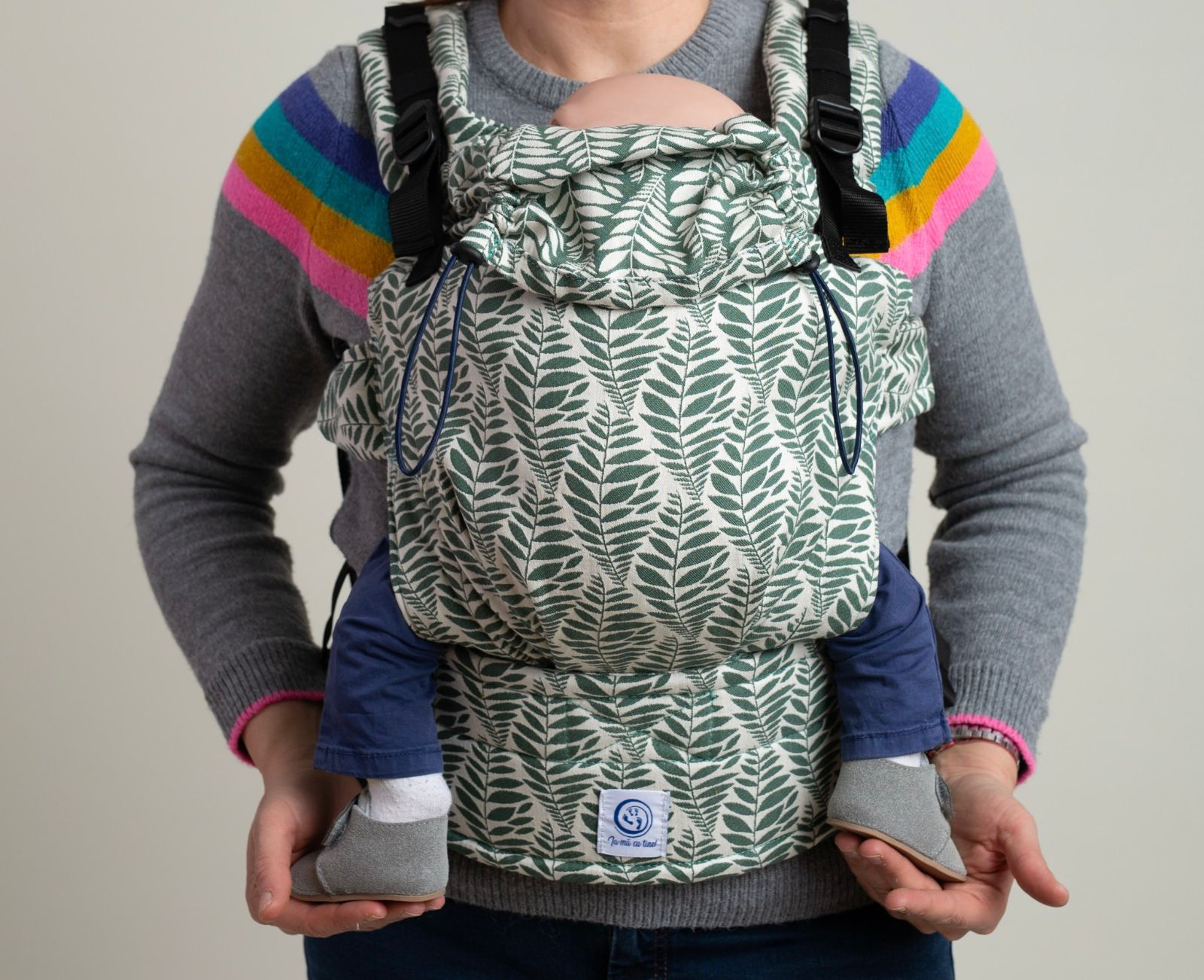 Materialul folosit este bumbac țesut 100%, într-o țesătură jacquard de 230 g/m², produsă special pentru noi de JAC Art. Este certificat OEKO-TEX Standard 100, garantând siguranță pentru pielea sensibilă a bebelușilor și vopsele non-toxice. Bumbacul este natural, non-alergen, respirabil, absoarbe și elimină umezeala, nu eliberează particule iritante și poate fi sterilizat cu ușurință. Cataramele Duraflex și chingile sunt certificate pentru calitate și rezistență conform standardelor internaționale.