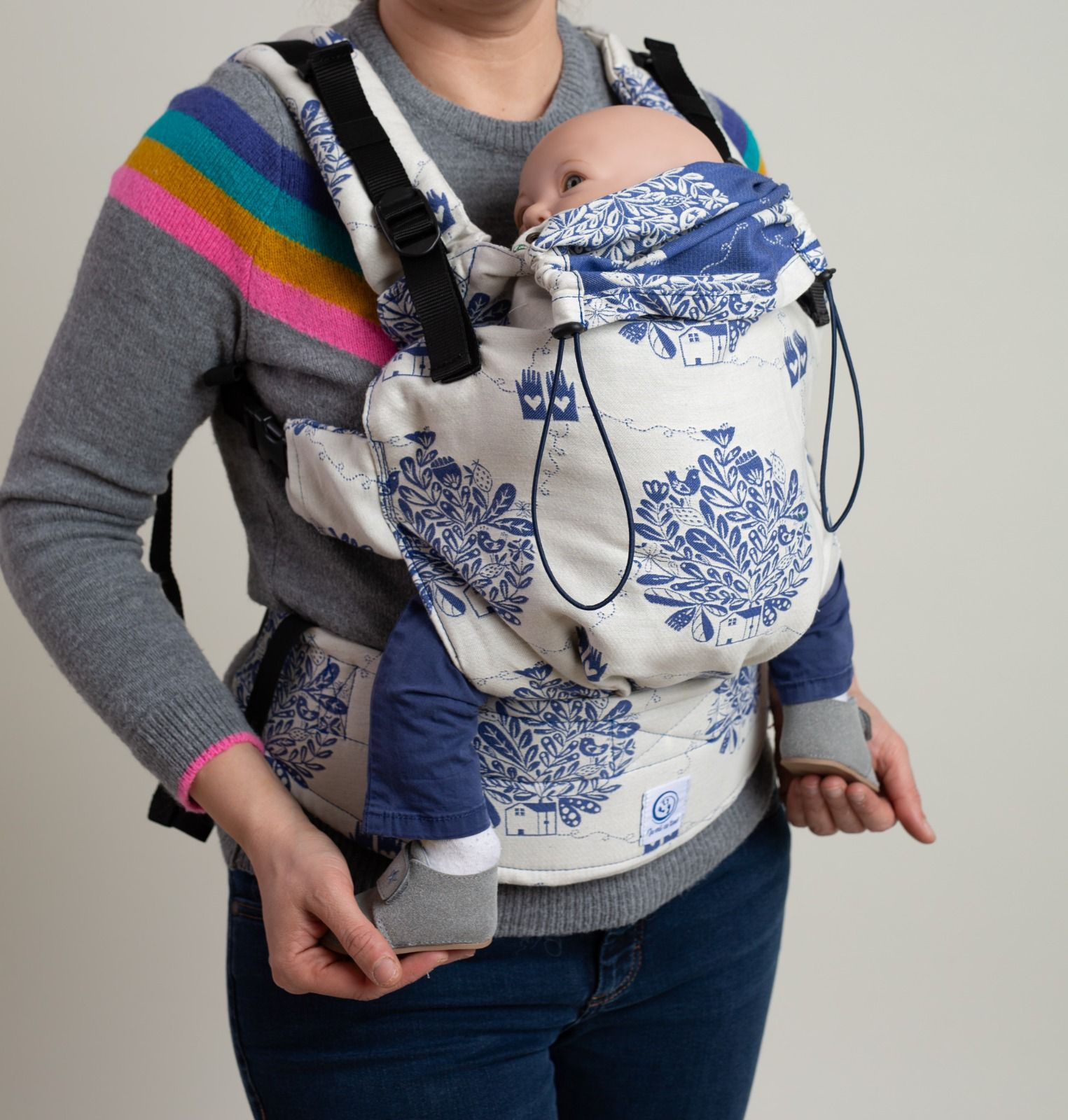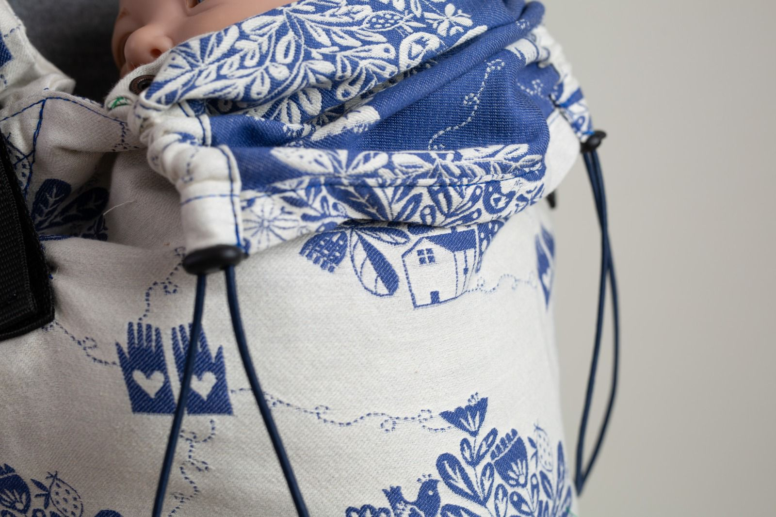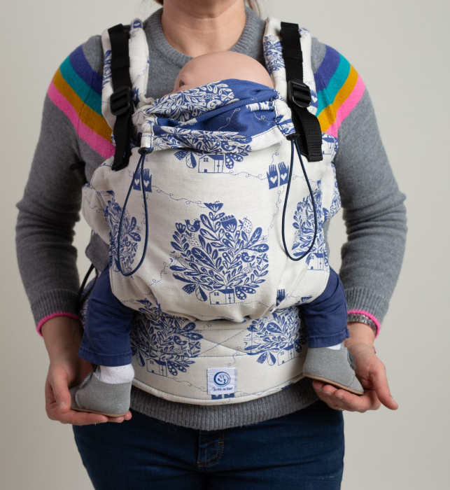 Sistemul este prevăzut cu glugă detașabilă, prinsă în capse, utilă pentru somn, sprijinul capului sau protecție împotriva vântului. Bebelușul poate fi purtat în față încă de la început, iar după 4–6 luni poate fi purtat și în spate sau pe șold, în funcție de preferințele purtătorului.