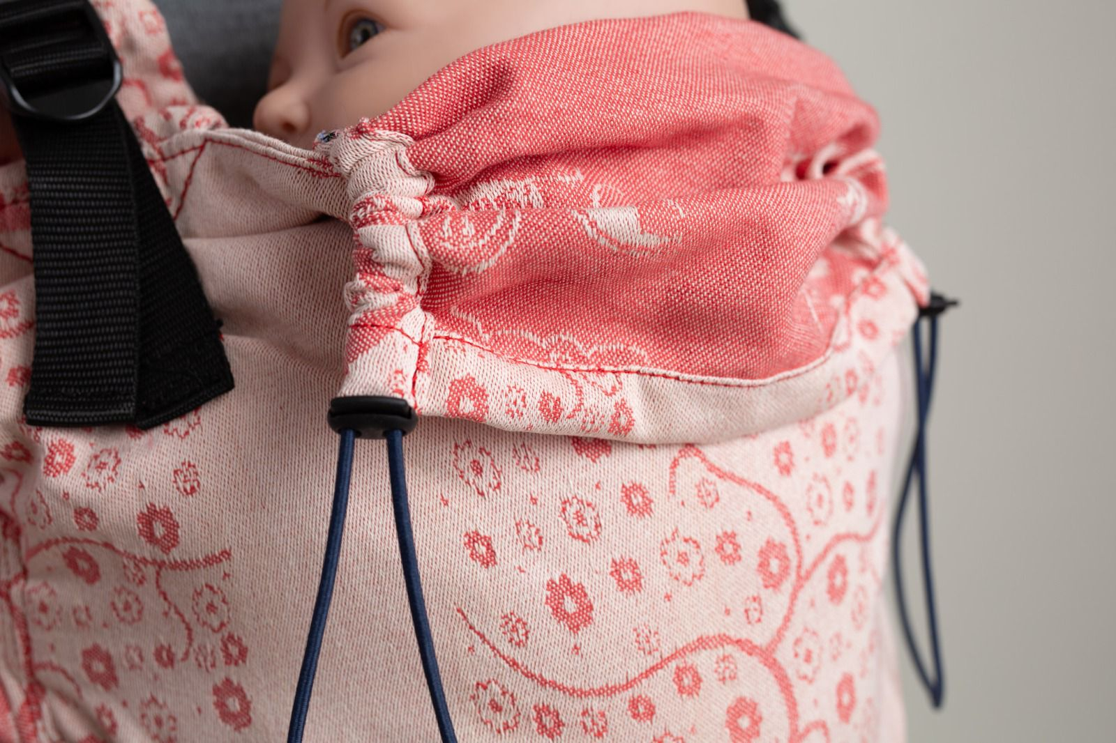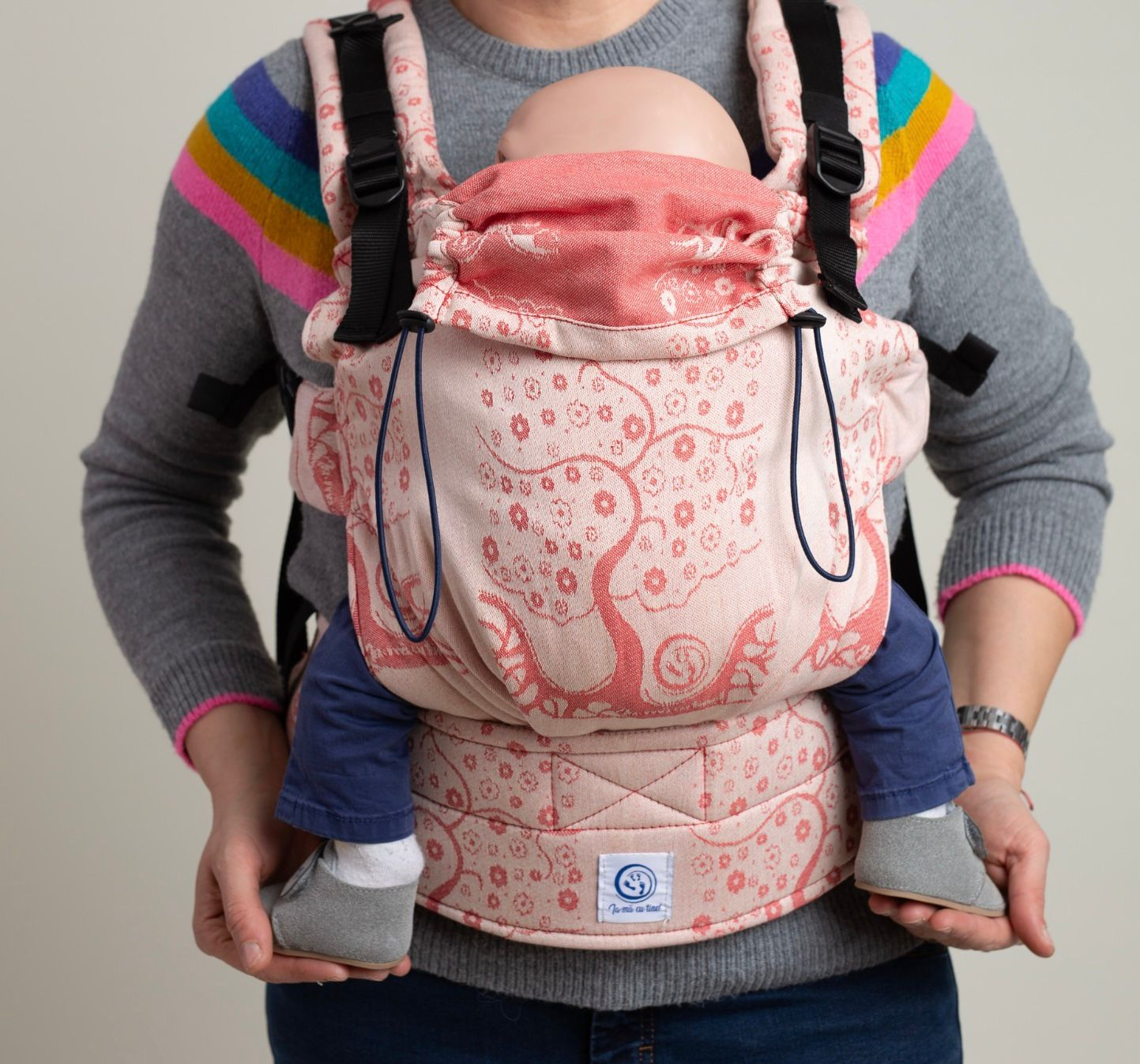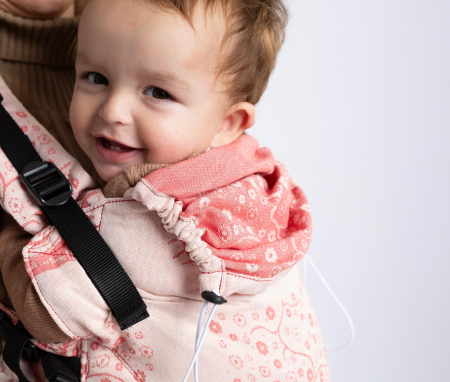 Sistemul este prevăzut cu glugă detașabilă, prinsă în capse, utilă pentru somn, sprijinul capului sau protecție împotriva vântului. Bebelușul poate fi purtat în față încă de la început, iar după 4–6 luni poate fi purtat și în spate sau pe șold, în funcție de preferințele purtătorului.