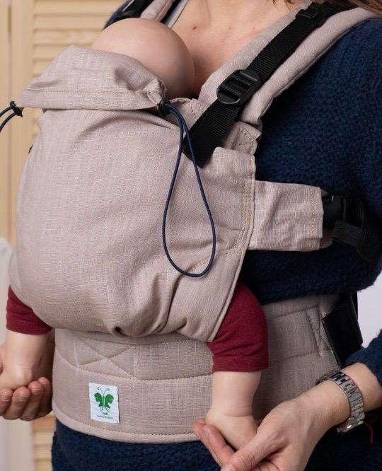 Sistemul este prevăzut cu glugă detașabilă, prinsă în capse, utilă pentru somn, sprijinul capului sau protecție împotriva vântului. Bebelușul poate fi purtat în față încă de la început, iar după 4–6 luni poate fi purtat și în spate sau pe șold, în funcție de preferințele purtătorului.