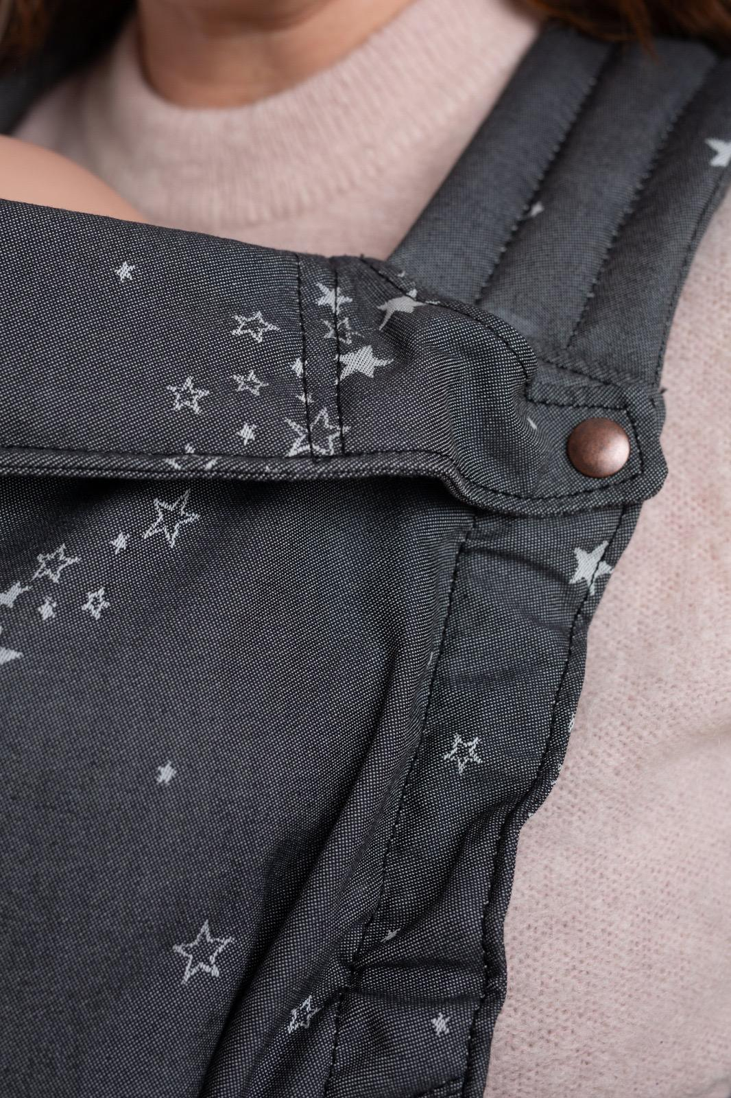 Materialul folosit este bumbac țesut 100%, într-o țesătură jacquard de 230 g/m², produsă special pentru noi de JAC Art. Este certificat OEKO-TEX Standard 100, garantând siguranță pentru pielea sensibilă a bebelușilor și vopsele non-toxice. Bumbacul este natural, non-alergen, respirabil, absoarbe și elimină umezeala, nu eliberează particule iritante și poate fi sterilizat cu ușurință. Cataramele Duraflex și chingile sunt certificate pentru calitate și rezistență conform standardelor internaționale.