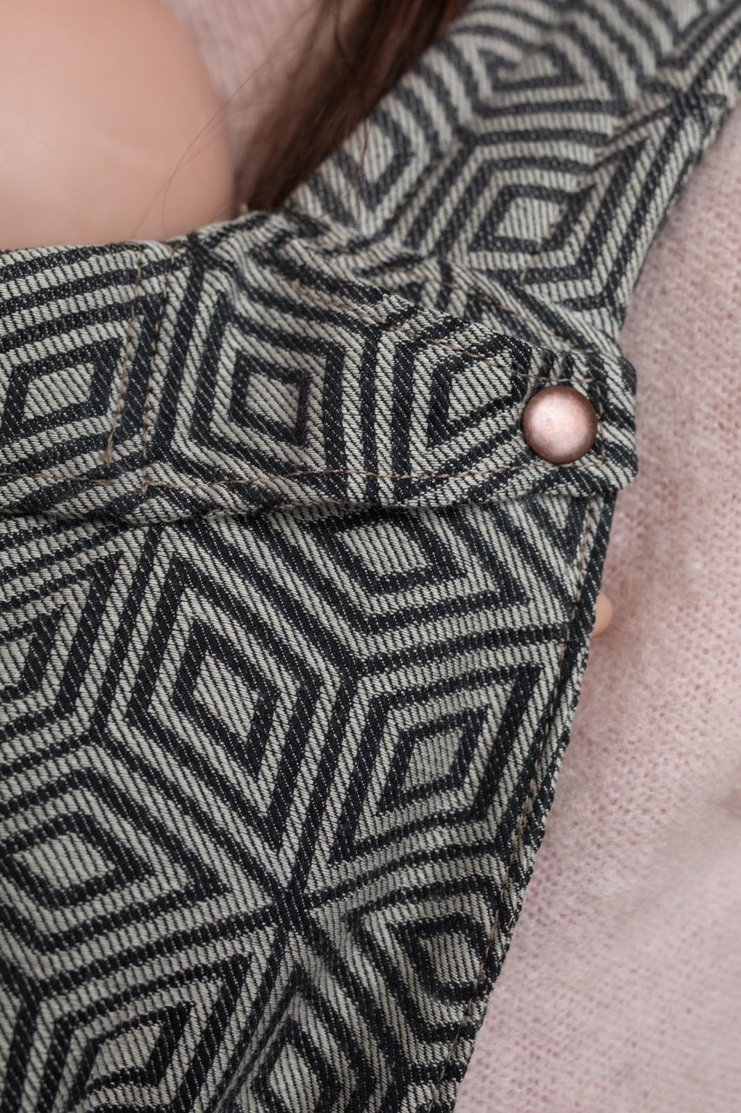 Materialul folosit este bumbac țesut 100%, într-o țesătură jacquard de 230 g/m², produsă special pentru noi de JAC Art. Este certificat OEKO-TEX Standard 100, garantând siguranță pentru pielea sensibilă a bebelușilor și vopsele non-toxice. Bumbacul este natural, non-alergen, respirabil, absoarbe și elimină umezeala, nu eliberează particule iritante și poate fi sterilizat cu ușurință. Cataramele Duraflex și chingile sunt certificate pentru calitate și rezistență conform standardelor internaționale.